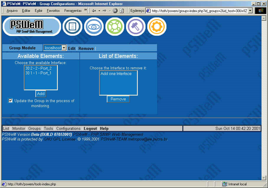 Neste cadastro, temos um passo importantíssimo na inserção de interfaces ao monitoramento: a indicação de quais interfaces detectadas no novo equipamento serão inseridas no Grupo criado. Observando a Figura 2.11, podemos ver um Grupo de nome 'localhost' e duas interfaces na lista de 'Elementos Disponíveis'. Para inserir estas duas interfaces no Grupo 'localhost', basta selecioná-las e clicar em 'Add'. Imediatamente estas interfaces sairão da lista de 'Elementos Disponíveis' e passarão para a lista 'Lista de Elementos', que indica quais interfaces pertencem ao grupo indicado no campo 'Group Module'.