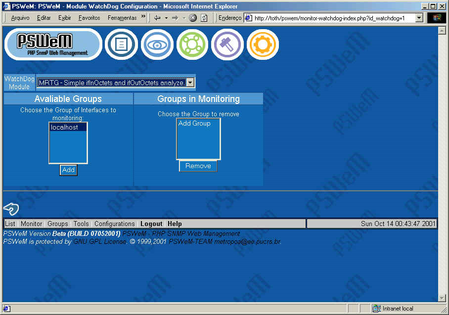 Estando o módulo do Processo selecionado na lista "WatchDog Module", selecione o Grupo na lista 'Available Groups' e clique em 'Add'. Imediatamente este Grupo passará para a lista dos grupos em monitoração: 'Groups in Monitoring'.
