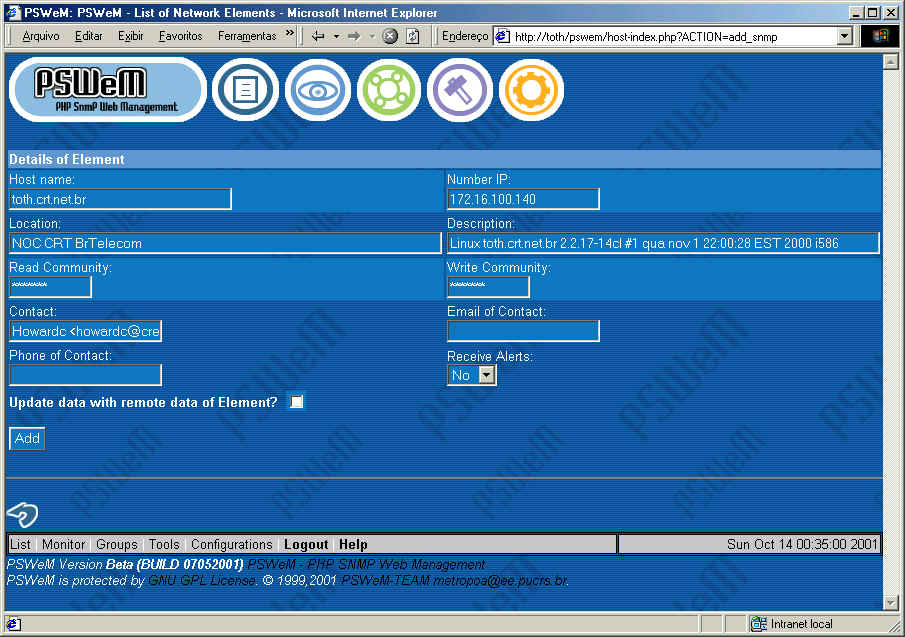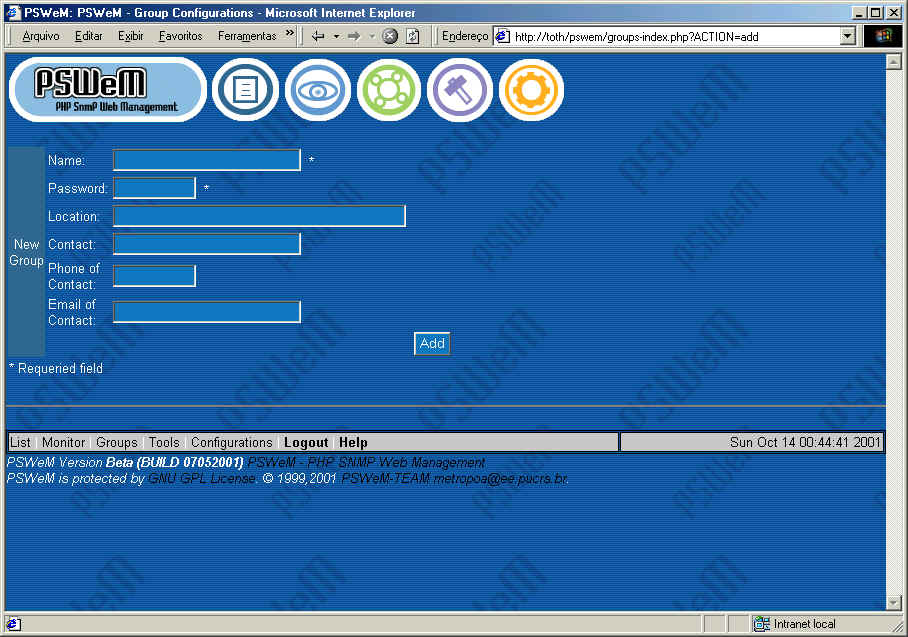O conceito de Grupos no PSWeM é muito importante. Todas as interfaces cadastradas devem estar inseridas em um Grupo, e este por sua vez é que será adicionado na monitoração. Também é através do grupo que o usuário poderá acessar o PSWeM e visualizar os relatórios das interfaces por ele utilizadas. Nesta etapa do processo de inserção, caso não exista nenhum Grupo cadastrado (na primeira vez que você estiver inserindo elementos na monitoração), o PSWeM automaticamente chama o cadastro de Grupos (Figura 2.10). Informe os dados necessários e clique em "Add".